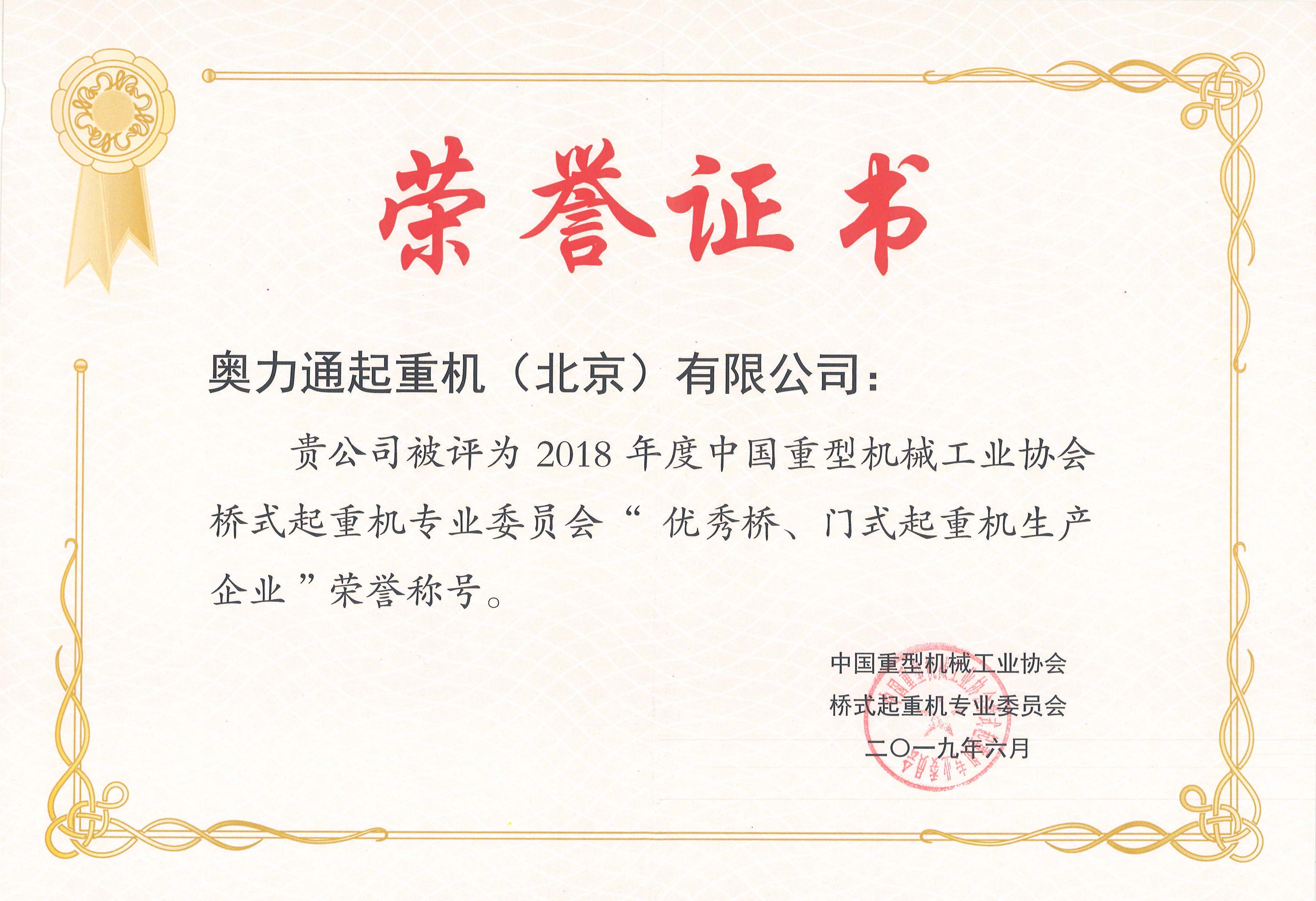 333体育荣获“优秀桥、门式起重机生产企业”称号